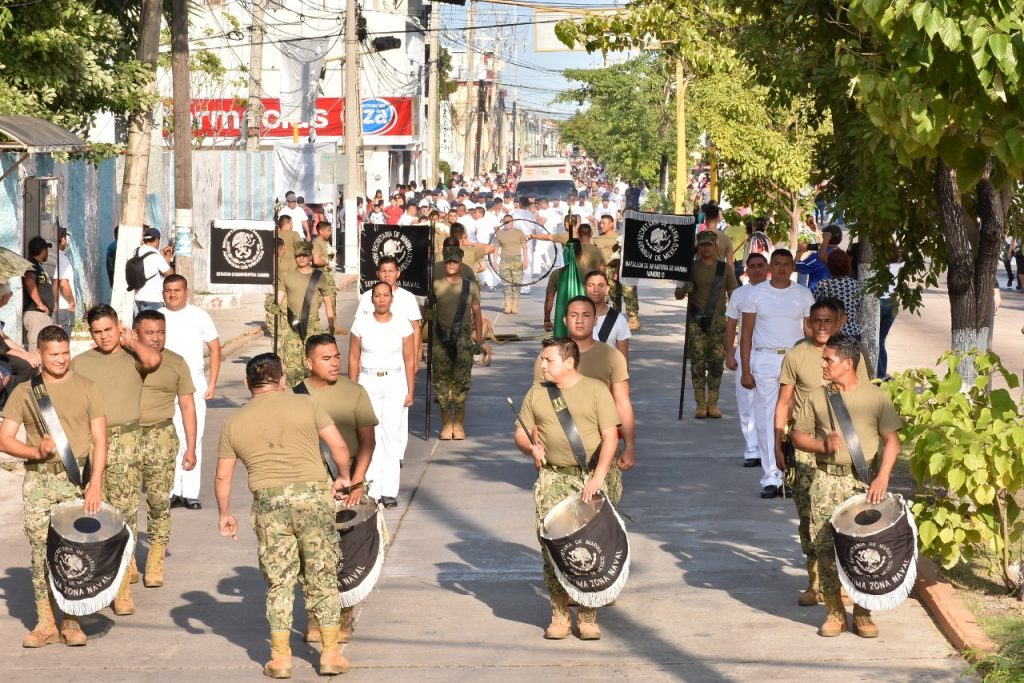 Previo a la ceremonia cívica conmemorativa, más de 3 mil alumnos de escuelas primarias, secundarias y preparatorias de Carmen desfilaron sobre la calle 56, donde los carmelitas aplaudieron este histórico recorrido porque por primera vez los estudiantes transitaron en un espacio corto sin obstaculizar el tránsito vehicular en el centro de la ciudad.