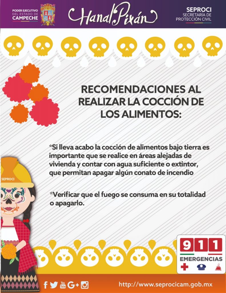 Asimismo, si realiza la cocción de alimentos bajo tierra es importante que cuente con una cubeta de agua, tierra o arena en caso de presentarse un incendio, evite mantenerse cerca del calor y evite que menores jueguen en los alrededores, en caso de quemaduras solo aplique agua y llame a las unidades de emergencia; si realiza la cocción en hornos convencionales verifique que no tengan fugas de gas y en caso de detectarlo cierre el tanque y llame al 911.