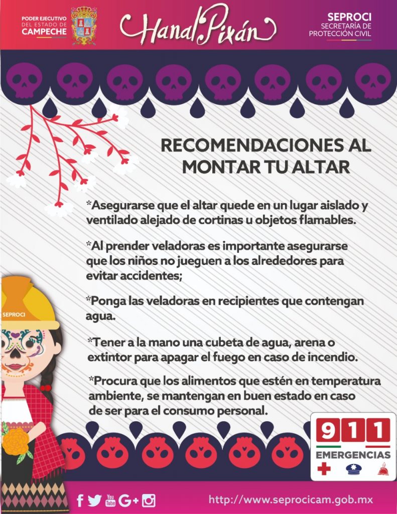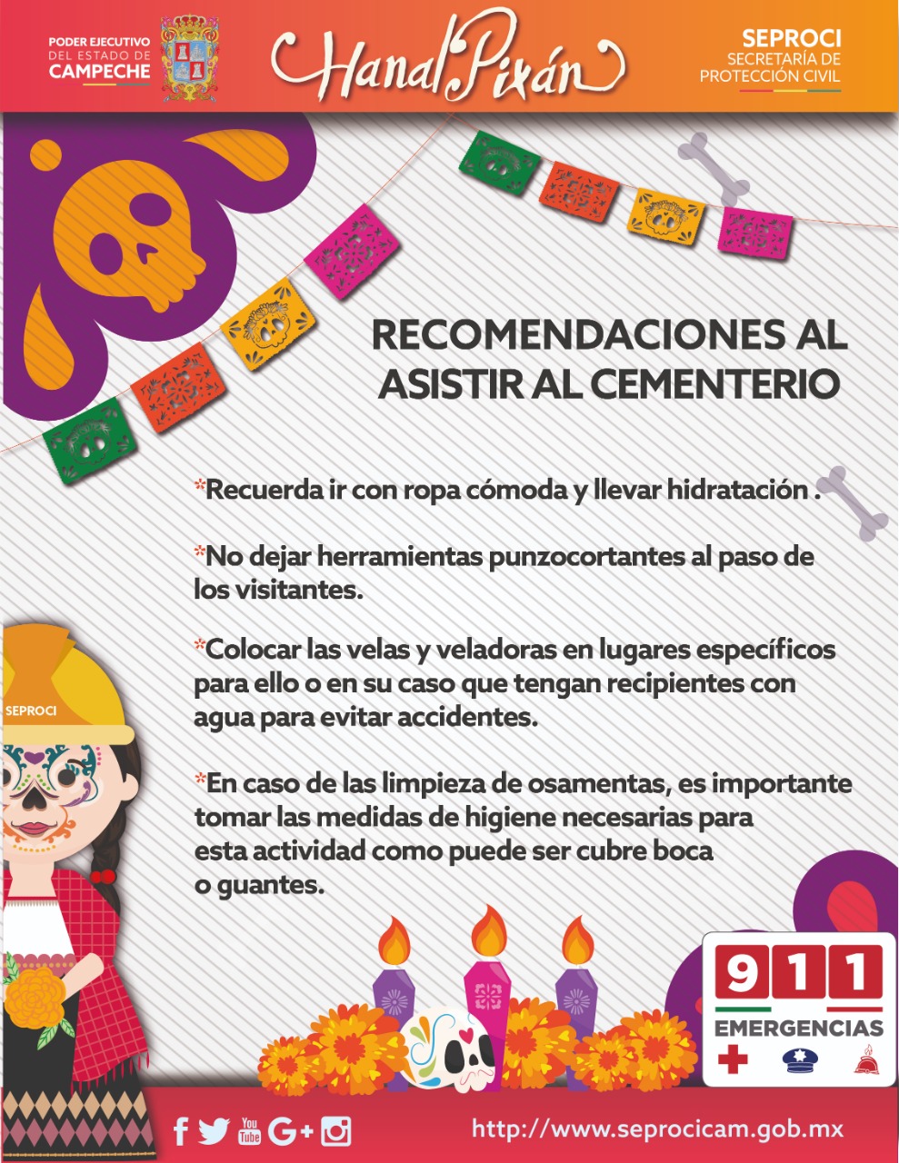 Ante la importancia de la celebración del Hanal Pixán y Fieles Difuntos 2019, el titular de la Secretaría de Protección Civil (SEPROCI), Edgar R. Hernández Hernández invita a la población a seguir con las recomendaciones que se emiten para evitar accidentes durante dicha festividad.