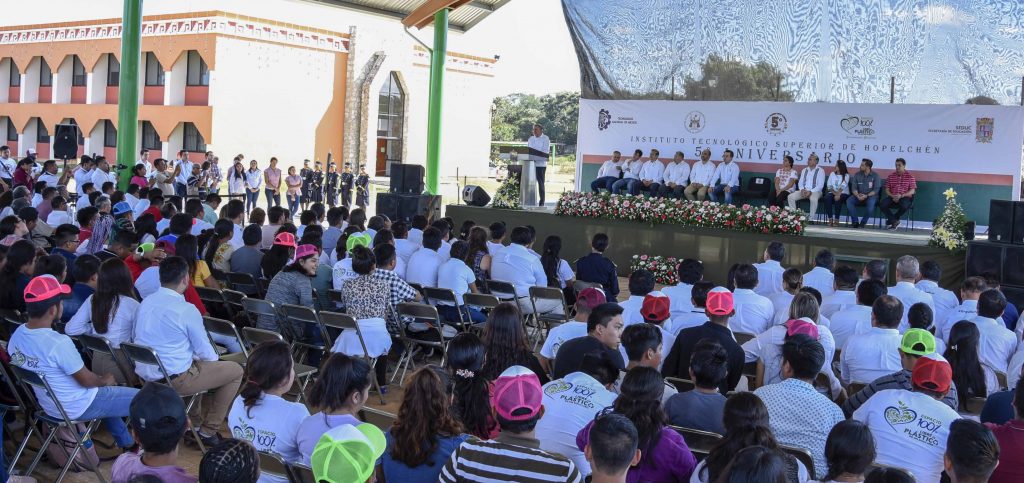 Luego de su encuentro con productores y autoridades rurales, acompañado del director de Institutos Tecnológicos Descentralizados del Tecnológico Nacional de México, Manuel Chávez Sáenz, y del secretario de Educación, Ricardo Koh Cambranis, presidió la ceremonia conmemorativa del V Aniversario del Instituto Tecnológico Superior de Hopelchén, donde se entregaron reconocimientos al primer director general, Edilberto Rosado Méndez, a personal fundador y a cuatro nuevos alumnos -egresados del Cecytec y Cobacam con promedios arriba del 9- que obtuvieron más de 1000 puntos en el examen de ingreso del Ceneval.
