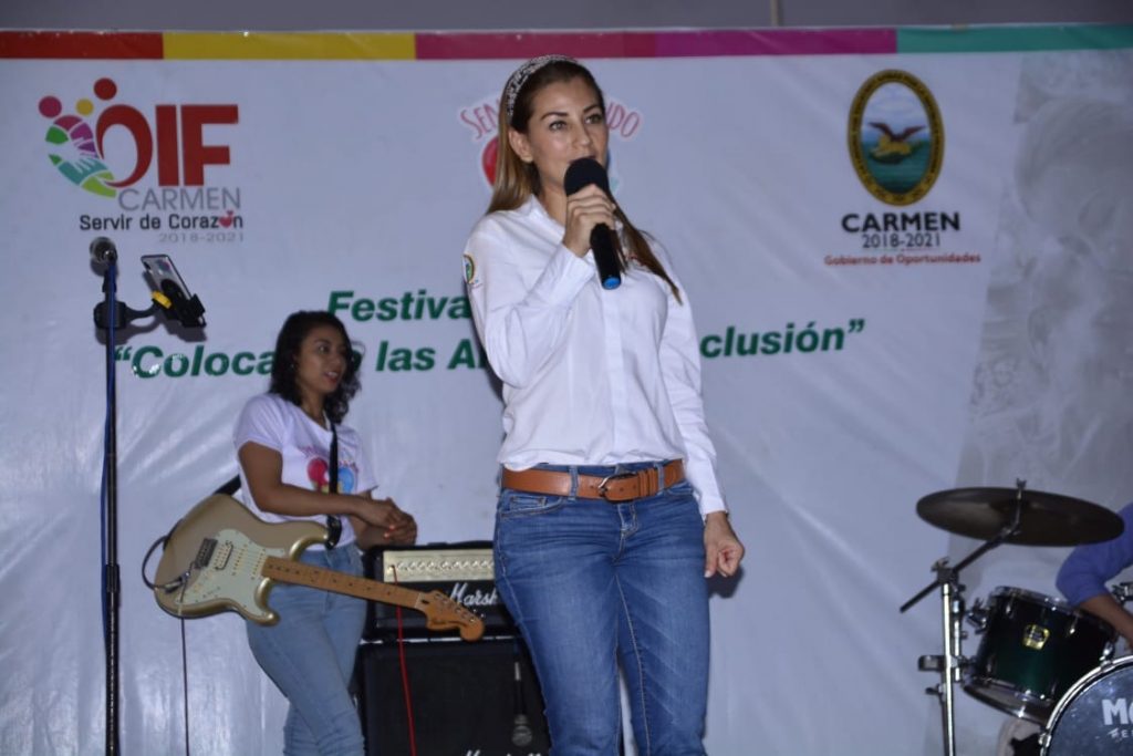 La Presidenta del Patronato del DIF Carmen, Viridiana Suárez de Rosas, en su intervención durante el festival cultural, hizo un llamado a la comunidad en general a impulsar en conjunto, sociedad y gobierno, una cultura inclusiva, realizando acciones que generen integración de todos los grupos vulnerables.