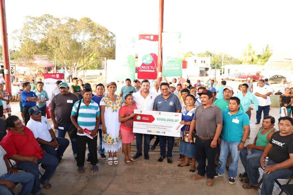Con “Crece tu Comunidad” de SOLUCIONES, son 500 mil pesos para rehabilitar espacios públicos comunitarios de 10 localidades y 5 colonias, a beneficio de 26 mil 408 habitantes de Cumpich, Hecelchakán y Pomuch. Las colonias recibieron 20 mil pesos y las localidades 40 mil pesos.