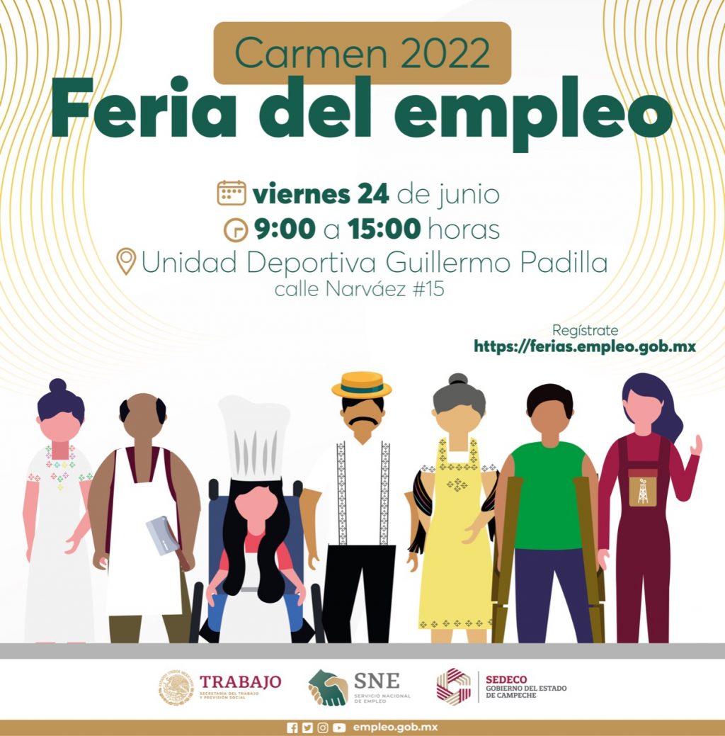 El Gobierno del Estado de Campeche realizará la segunda Feria Nacional del Empleo 2022, el viernes 24 de junio en la Unidad Deportiva Guillermo Padilla en Ciudad del Carmen, Campeche, con horario de 9:00 de la mañana a 3:00 de la tarde.