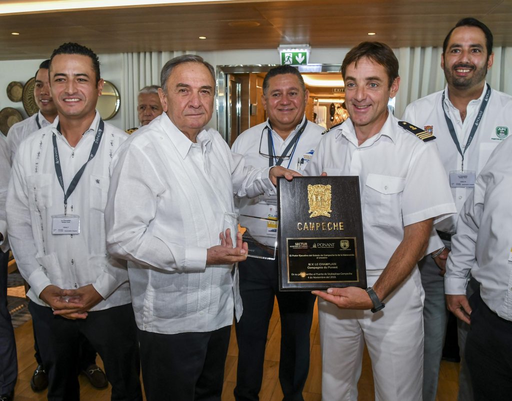 SEYBAPLAYA-. Tras la llegada a tierras campechanas de 184 turistas franceses a bordo del crucero Le Champlain de la compañía Ponant, el gobernador Carlos Miguel Aysa González recorrió la embarcación e intercambió, como símbolo de bienvenida a la entidad, placas conmemorativas de la primera visita con el capitán Yannick Herve Marié Simón.