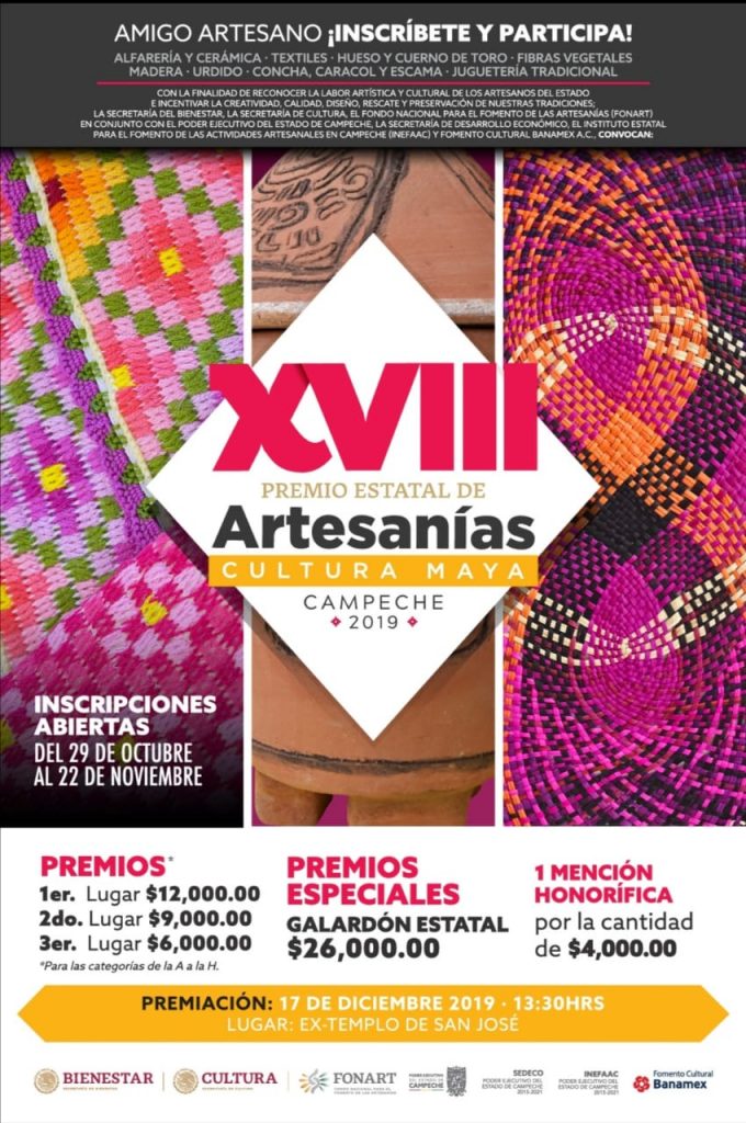 En reconocimiento a la labor artística y cultural de los artesanos de la entidad, y para incentivar la creatividad, calidad, diseño, rescate y preservación de las tradiciones, la directora del Instituto Estatal para el Fomento de las Actividades Artesanales en Campeche (INEFAAC) Angélica Guerrero Sasía, en coordinación con el titular de la Secretaría de Desarrollo Económico, Gabriel Escalante Castillo lanzaron la convocatoria del XVIII Premio Estatal de Artesanías “Cultura Maya Campeche 2019”.