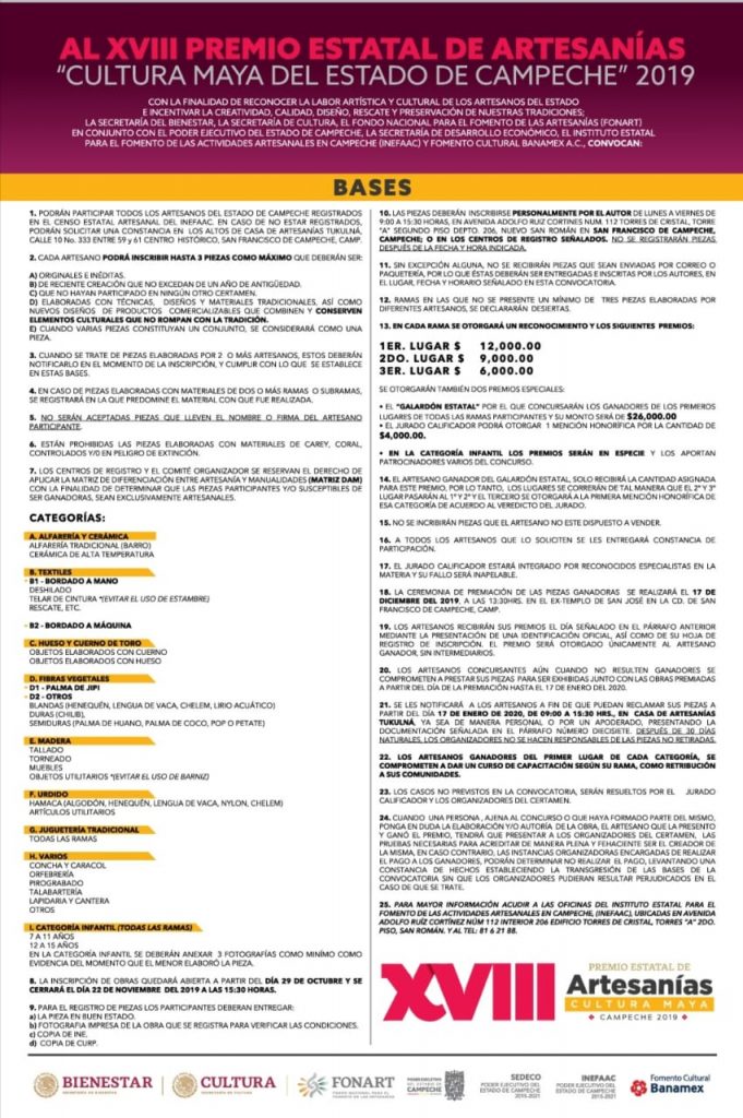 Las bases las podrán consultar en las redes sociales del INEFAAC Artesanías Campeche y en las oficinas de la dependencia, ubicadas en Avenida Adolfo Ruíz Cortines núm. 112, interior 206, edificio Torres de Cristal.