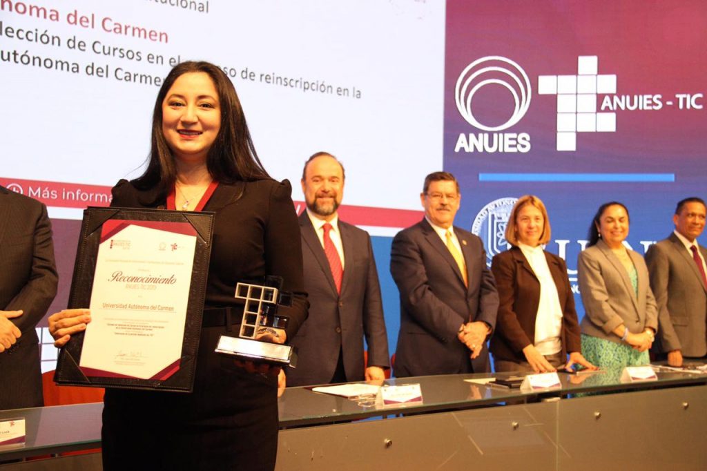 Por segundo año consecutivo, la Asociación Nacional de Universidades e Instituciones de Educación Superior (ANUIES) entregó a la comunidad universitaria el “Reconocimiento ANUIES-TIC 2019” categoría Innovación de la gestión mediante las Tecnologías de la Información y Comunicación, en esta edición por el proyecto “Sistema de selección de cursos en el proceso de reinscripción en la UNACAR”.