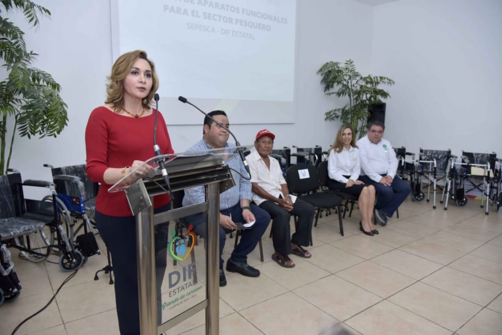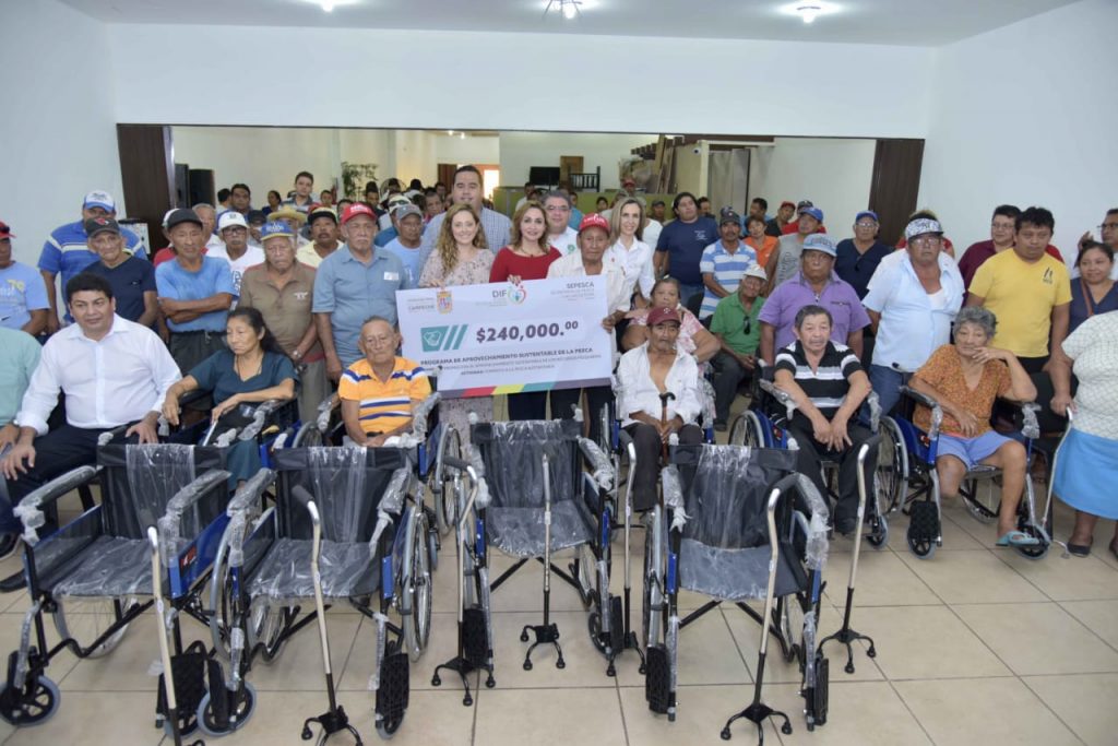 “Continuemos trabajando en equipo, de forma cercana y armónica, alentados por el mensaje de servicio a la sociedad que promueve mi esposo, el Gobernador Carlos Miguel Aysa González” afirmó la presidenta del Patronato del DIF Estatal, Victoria Damas de Aysa al entregar 144 aparatos funcionales con una inversión de 107 mil pesos del programa de Aprovechamiento Sustentable de la Pesca y de forma simbólica 240 mil pesos, del apoyo a grupos vulnerables del Sector pesquero, que recibió Luis Fernando Martínez Moo.