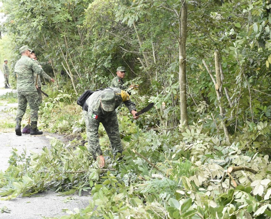 Por tal motivo tropas del Ejército y Fuerza Aérea de la 25/a. Compañía de Infantería No encuadrada en coordinación con autoridades municipales, llevaron a cabo actividades de Labor Social, mediante la remoción de escombros, lodo y maleza en beneficio de los habitantes del Municipio de Calakmul, Campeche.