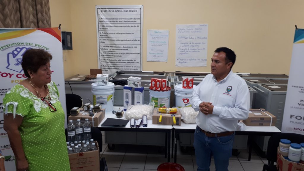 Al entregar apoyos del Programa Fortalecimiento para la Seguridad (FORTASEG), a la directora de la Escuela Secundaria General No. 5 Margarita Fernández Martínez, el alcalde de Carmen, Óscar Rosas González, ratifica su compromiso de seguir fortaleciendo junto con los gobiernos federal, estatal y su gobierno la infraestructura de los planteles educativos donde se forma al futuro del municipio, del estado de Campeche y de México.