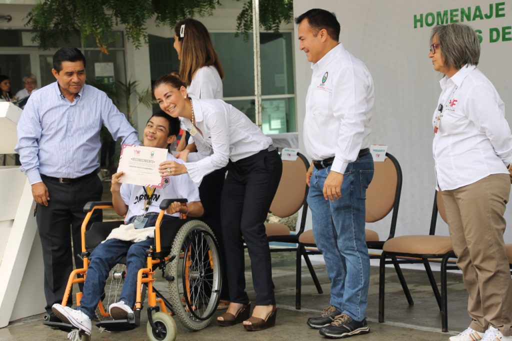 El homenaje cívico, fue el marco para hacer entrega de las despensas a jefes de familia, así como 20 pares de lentes a beneficiarios del Programa de Salud Visual. También en este marco, se hizo entrega del reconocimiento de participación a quienes recibieron la formación en los talleres de Manejo de Silla de Ruedas, Vida Independiente, Lenguaje de Señas Mexicanas y Lecto-Escritura en Braille, durante la Jornada Estatal Juntos por la Inclusión.