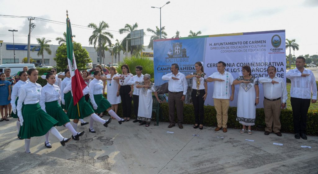 Previo a la ceremonia conmemorativa se realizaron los honores a la bandera donde los carmelitas orgullosos entonaron el himno nacional mexicano, así como el campechano.