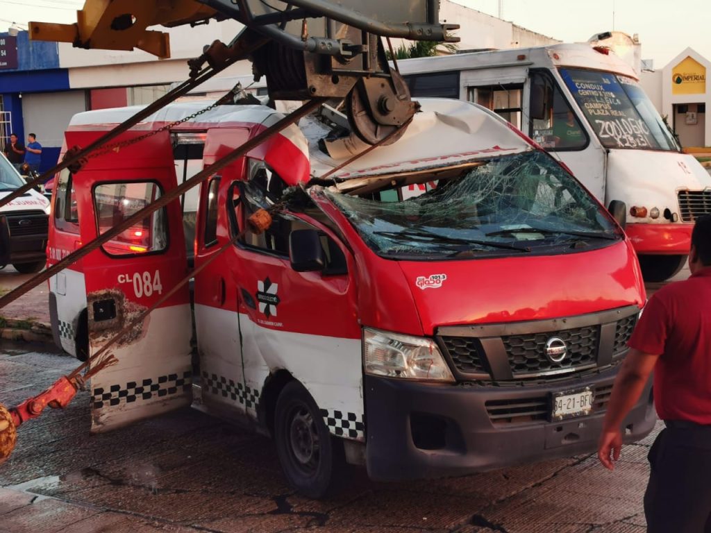 Un total de 9 personas lesionadas, fue el saldo de un aparatoso accidente entre una combi colectiva, y una grúa que salia de un patio de maniobras en la Colonia Pallás; todos los lesionados fueron trasladados en ambulancias de la Cruz Roja Mexicana a la clínica particular Santo Domingo para su valoración. Fue alrededor de las 17:00 horas, cuando sobre la avenida 47 esquina con calle 20, se desplazaba el conductor de una combi colectiva Nissan Urvan de la Ruta Santa Isabel, color rojo y blanco, con número económico CL084 y matrícula de circulación 84-21-BFC del estado de Campeche.