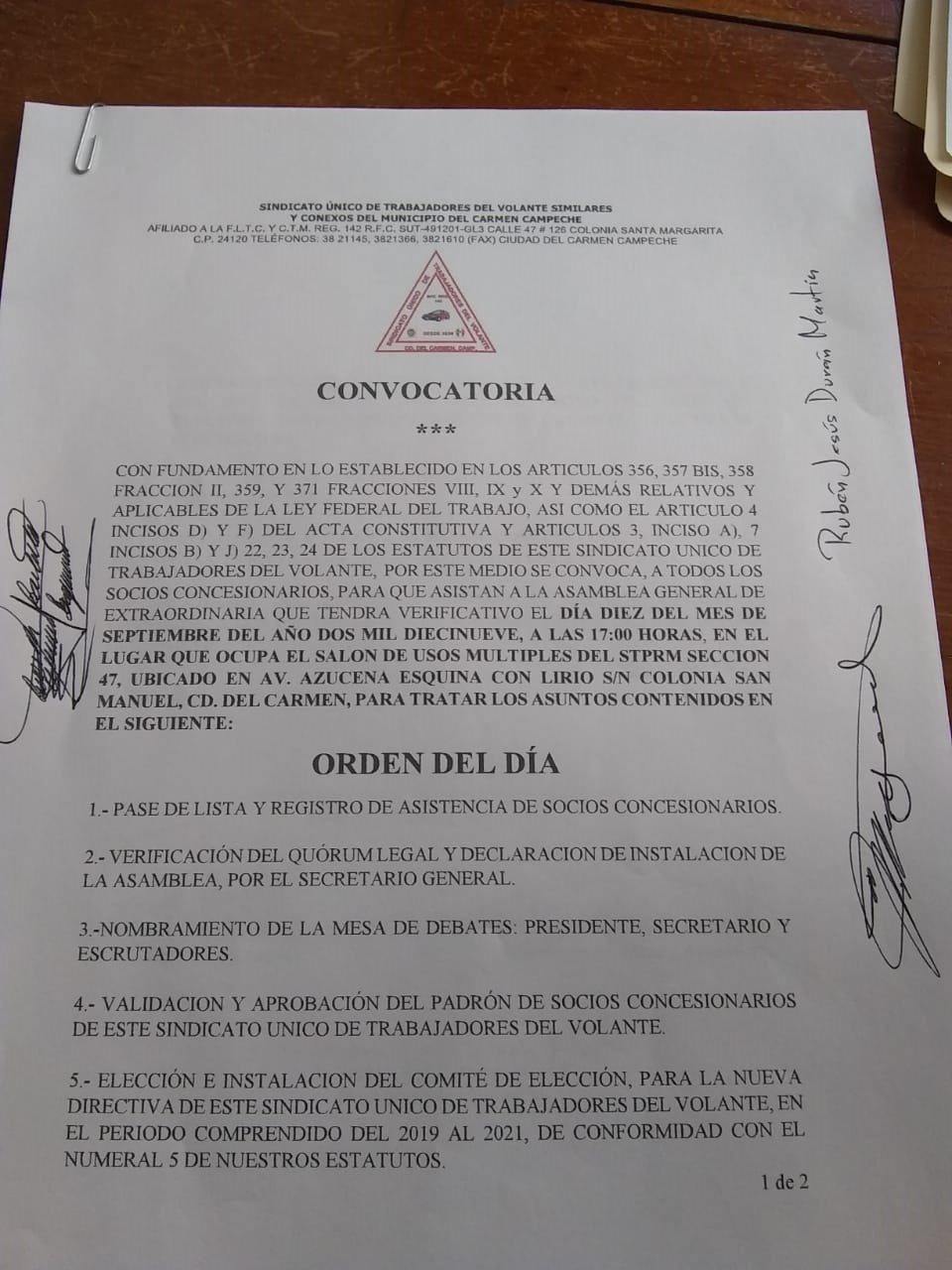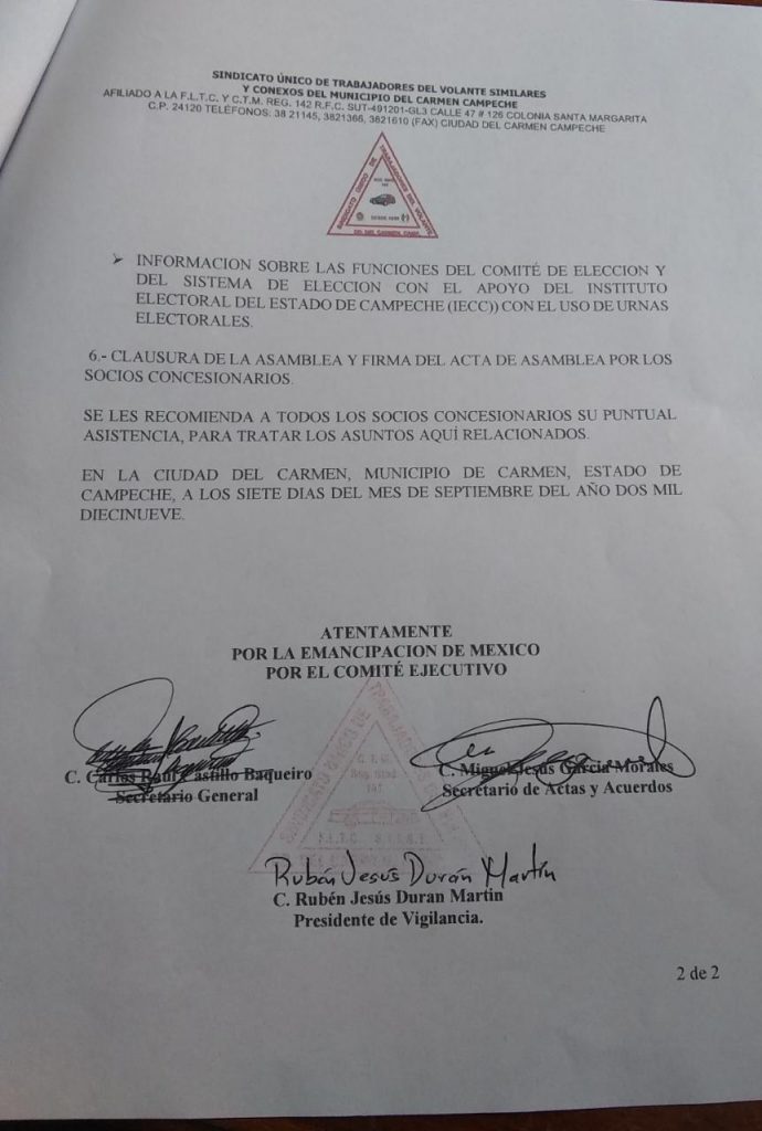 Con la publicación de la convocatoria con fecha 7 de septiembre para renovar la Secretaría General y la mesa directiva del Sindicato Único de Trabajadores del Volante (SUTV) en los medios impresos, radio, televisión y medios digitales de mayor circulación en la isla, se invita a todos los socios a la elección e instalación del Comité de Elección, este 10 de septiembre del 2019 en punto de las 5 de la tarde en las instalaciones del Sindicato Petrolero de la Sección 47 sito en Av. Azucena esquina con Lirio de la colonia San Manuel en la isla; para tratar los asuntos contenidos en dicho edicto.